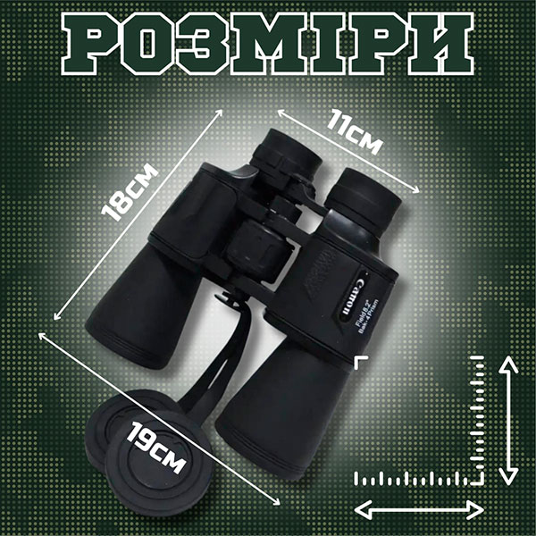 Оптичний бінокль "CANON" x70 має лінзи діаметром 50 мм та 50-кратне збільшення. Об'єкт на відстані 6500 метрів ви бачитимете як за 100 метрів від вас.
