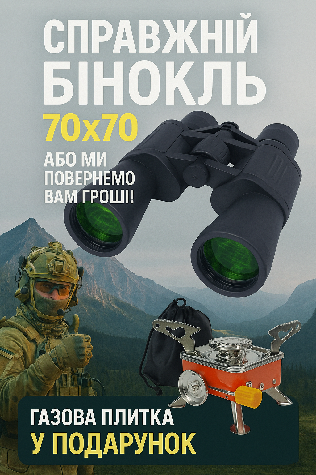 Супер бінокль 70х! Беремо із сім'єю у походи. Зображення не просто збільшується, але робиться найбільш чітким. Очі при цьому не напружуються, можна регулювати відстань між зіницями. Вага невелика, тримати не втомлюєшся, приємний на дотик